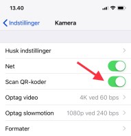 Scan QR kode med iPhonens indbyggede kameraMange er ikke klar over at man kan scanne en QR kode med det indbyggede kamera i iPhone. Tjek at nedenstående er slået til i indstillinger>kamera og så er det bare at åbne kameraet næste gang du støder på en QR kode.