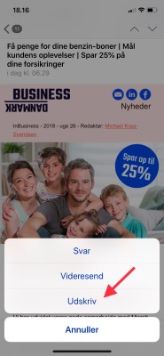 1. Når du har mailen åbnet trykker du på den lille venstredrejede pil, som du også bruger til at bevare en mail med. Herefter trykker du på udskriv.
