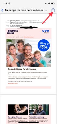 3. Nu kan du så maile, sende som besked, gemme i Filer, Dropbox, Noter o.s.v. ved trykke på den lille blå firkant med en pil op i øverste højre hjørne.