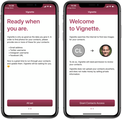 Udvikleren Casey Liss siger at, at “privatlivets fred er afgørende”, når det kommer til Vignette. Dette betyder, at processen foregår udelukkende på enheden, og intet uploades til en server.