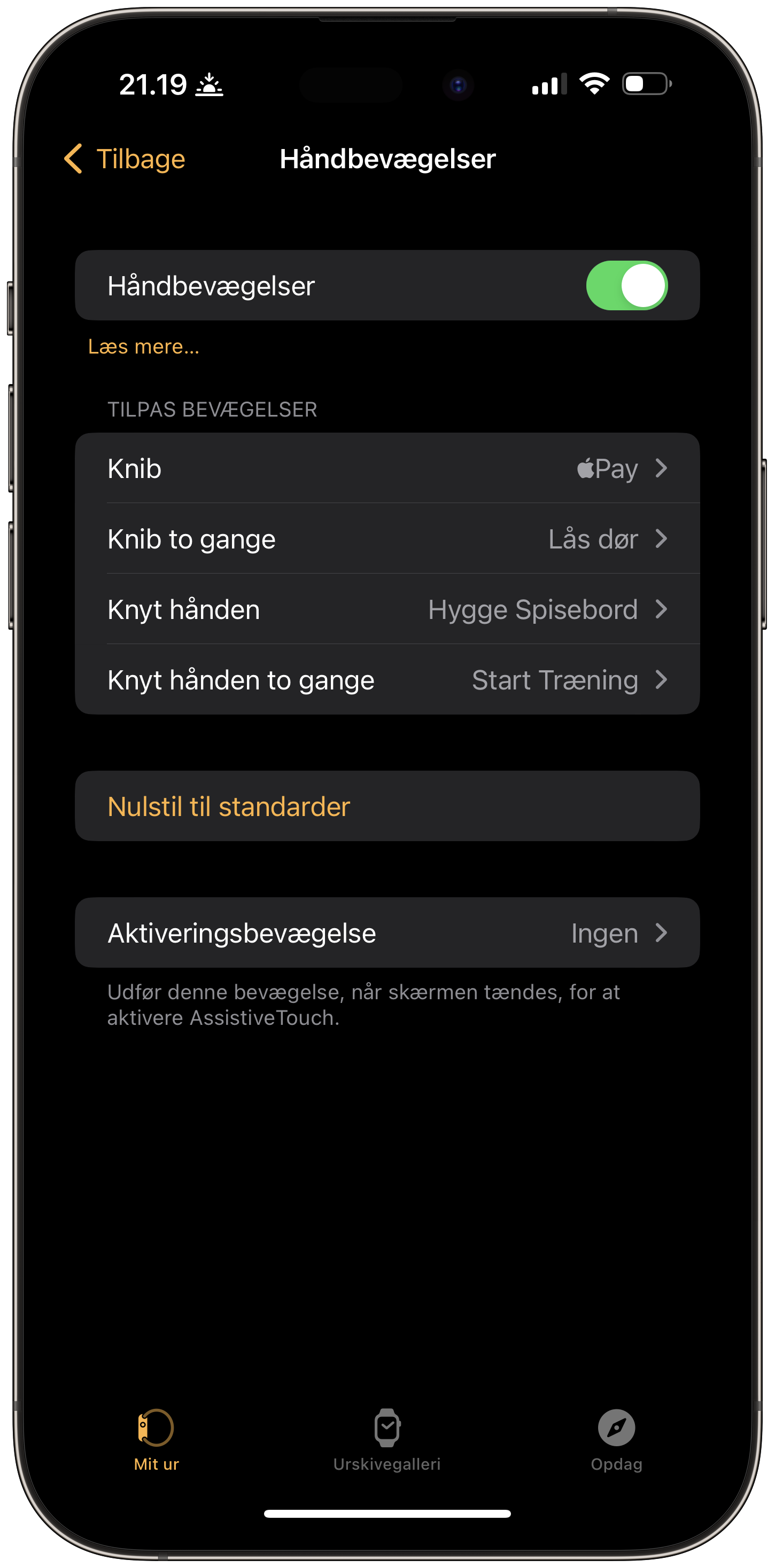 Den letteste måde at komme i gang er via Watch appen på din iPhone > tilgængelighed > assistive Touch > Håndbevægelser: