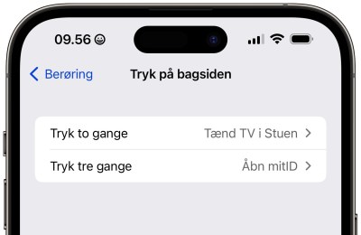 Så er din nye genvej lavet og nu skal du ind i Indstillinger og aktivere triggeren: tap på Tilgængelighed > berøring > tryk på bagsiden og her vælger du din genvej,som du lige har lavet