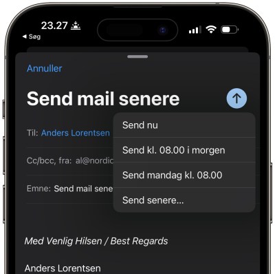 Siden iOS 16 blev frigivet, kom muligheden for ganske enkelt at trykke og holde på den blå pil i øverste højre hjørne og vælge at udsætte udsendelsen af en e-mail til et senere tidspunkt.