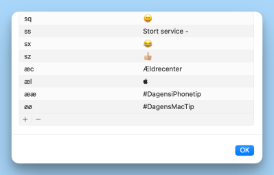 Her efter kan du ved at trykke på + tasten lave dine genveje. Her vælger jeg at sq = 😄 og sz = 👍🏼