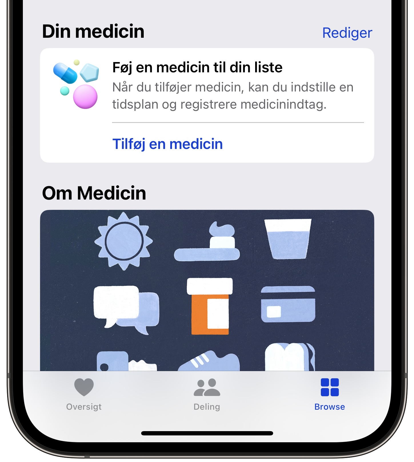 For at bruge denne funktion skal du blot åbne appen ”sundhed” på din iPhone, og derefter trykke på “Browse” og så vælge ”Medicin”-funktionen. Her kan du tilføje din medicin og indstille tidspunktet, hvor du skal tage den.