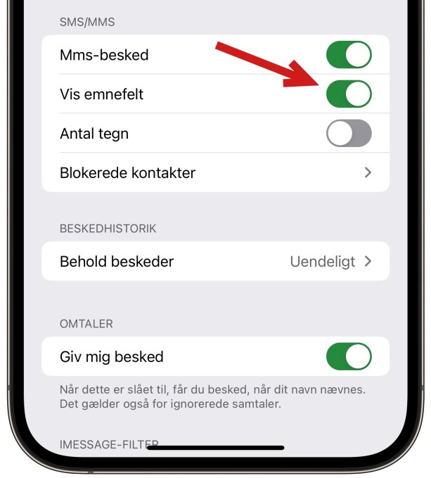 For at tilføje et emnefelt på iPhone, skal man gå til indstillinger > Beskeder og slå emnefelt til.