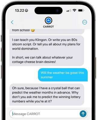 Man kan nu også føre en “samtale” med CARROTT. Appen har selvfølgelig også adapteret AI , så nu kan man spørge den om alt muligt, og du får helt sikkert en sarkatisk svar 😆