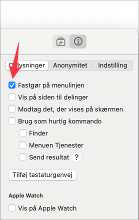 I højre side på det vindue der dukker op efter du har klikket på rediger, klikker du på det lille ⓘ og derefter sætter du et hak i “Fastgør på menulinjen”.