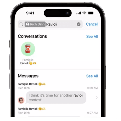 iOS 17-versionen af Beskeder har fået en stærkt forbedret søgefunktion som giver mulighed for at kombinere forskellige filtre – f.eks. et bestemt ord sammen med beskeder fra en specifik person. Tanken bag ændringen er, at du vil kunne indsnævre søgeresultaterne for at finde det, du leder efter, hurtigere.