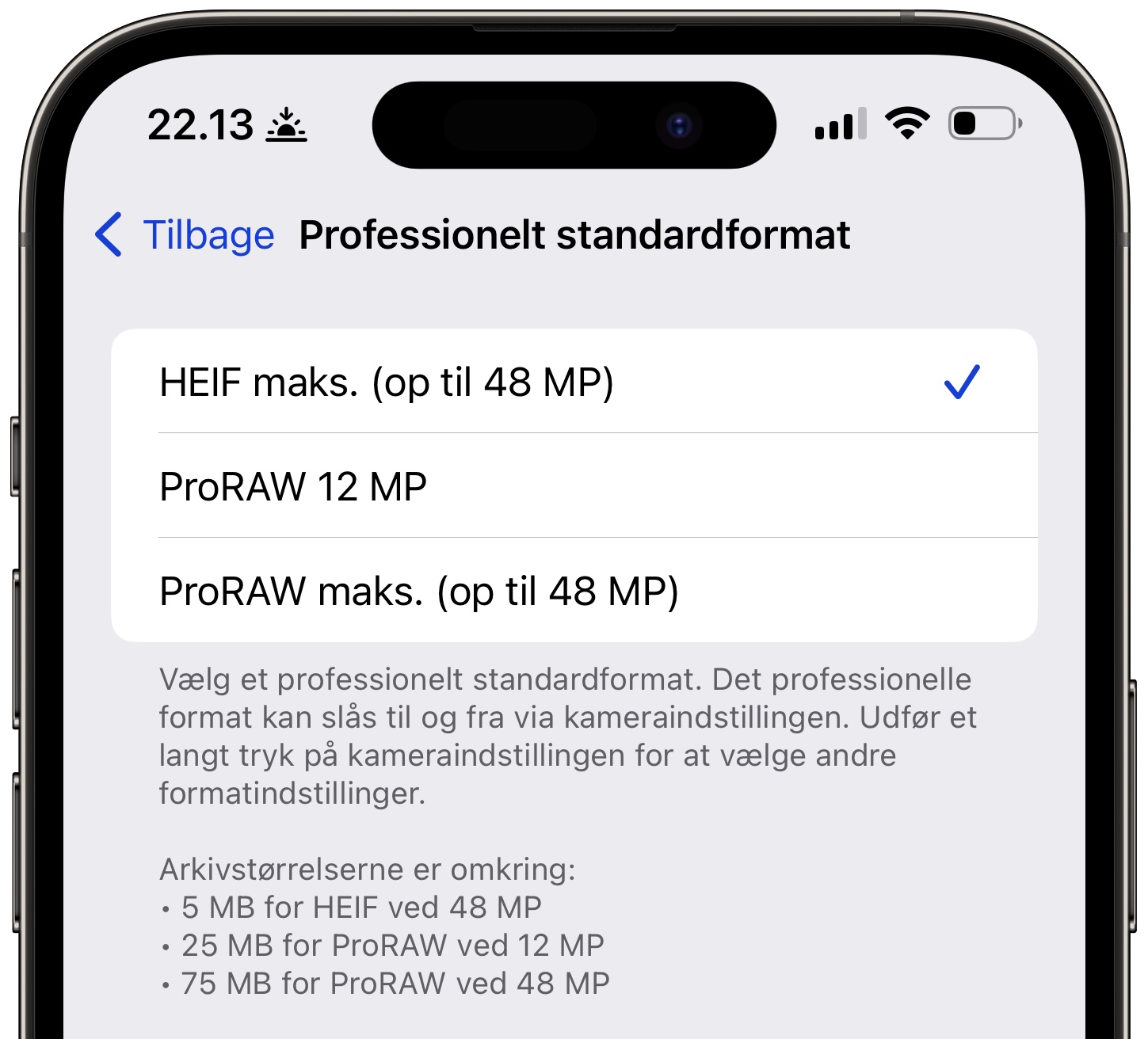 - Tryk professionelt standardformat og Skift til HEIF MAX (op til 48MP)