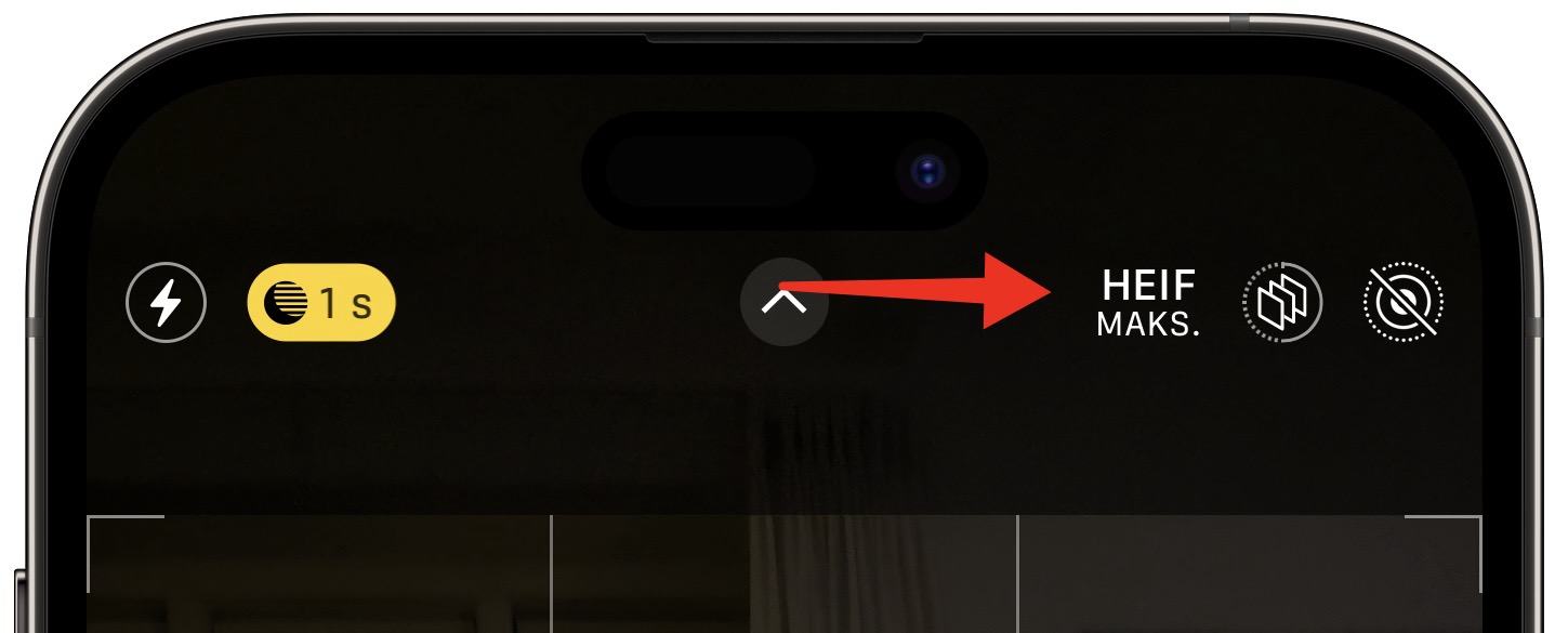 Nu er funktionen indstillet, men for at det kan tage effekt skal du aktivt vælge HEIF MAKS: inden du tager billedet. (som vist hér ⬇)