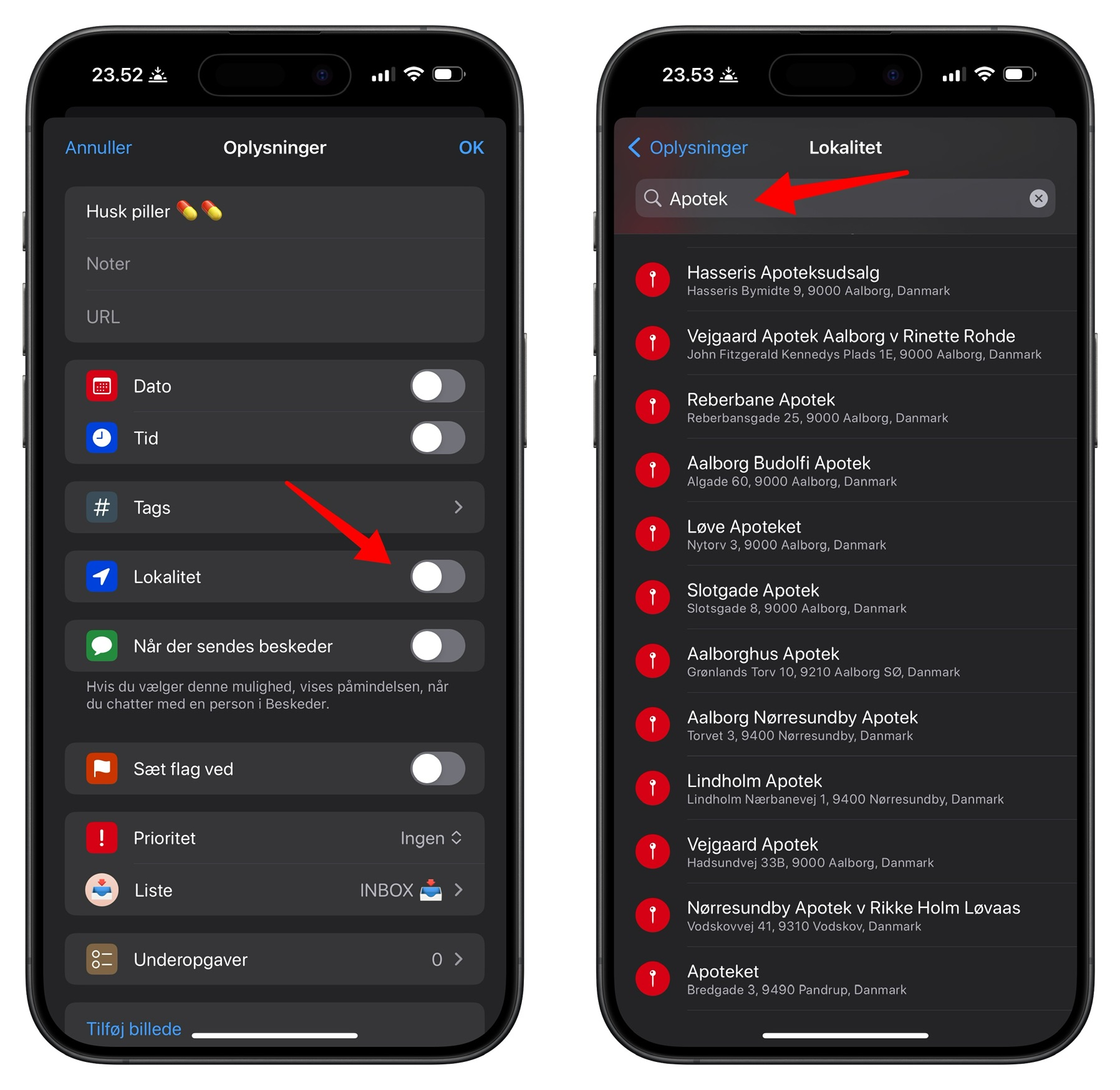 Man kan også ved at åbne Påmindelser appen oprette en påmindelse, når man kommer i nærheden af andre steder. Her kan du se hvordan man gør: