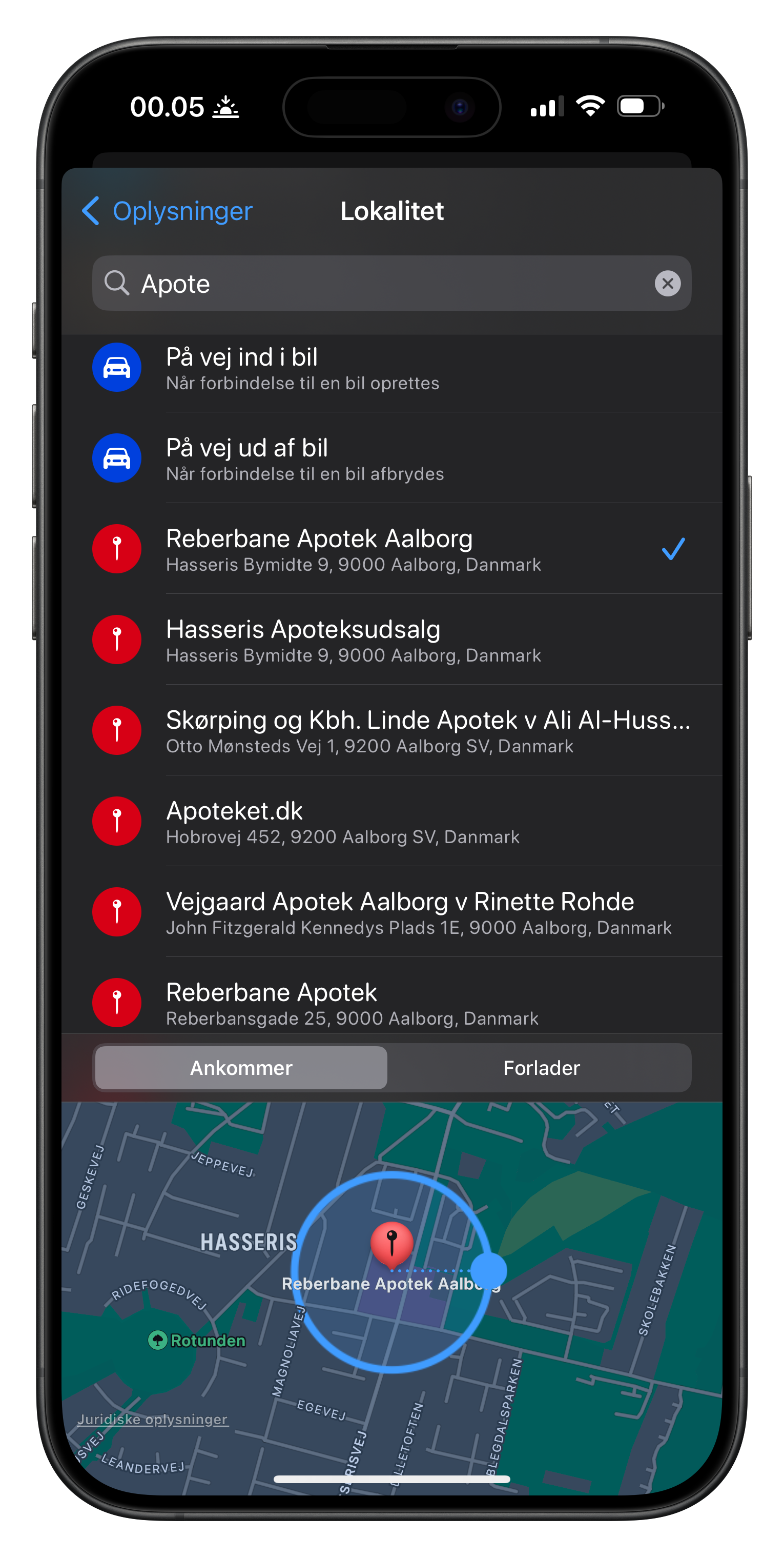 - Aktiver lokalitet og derefter tryk på det lille i, i den blå cirkel og søg efter en bestemt lokation. Her “apotek” og vælg det du skal hen til.
