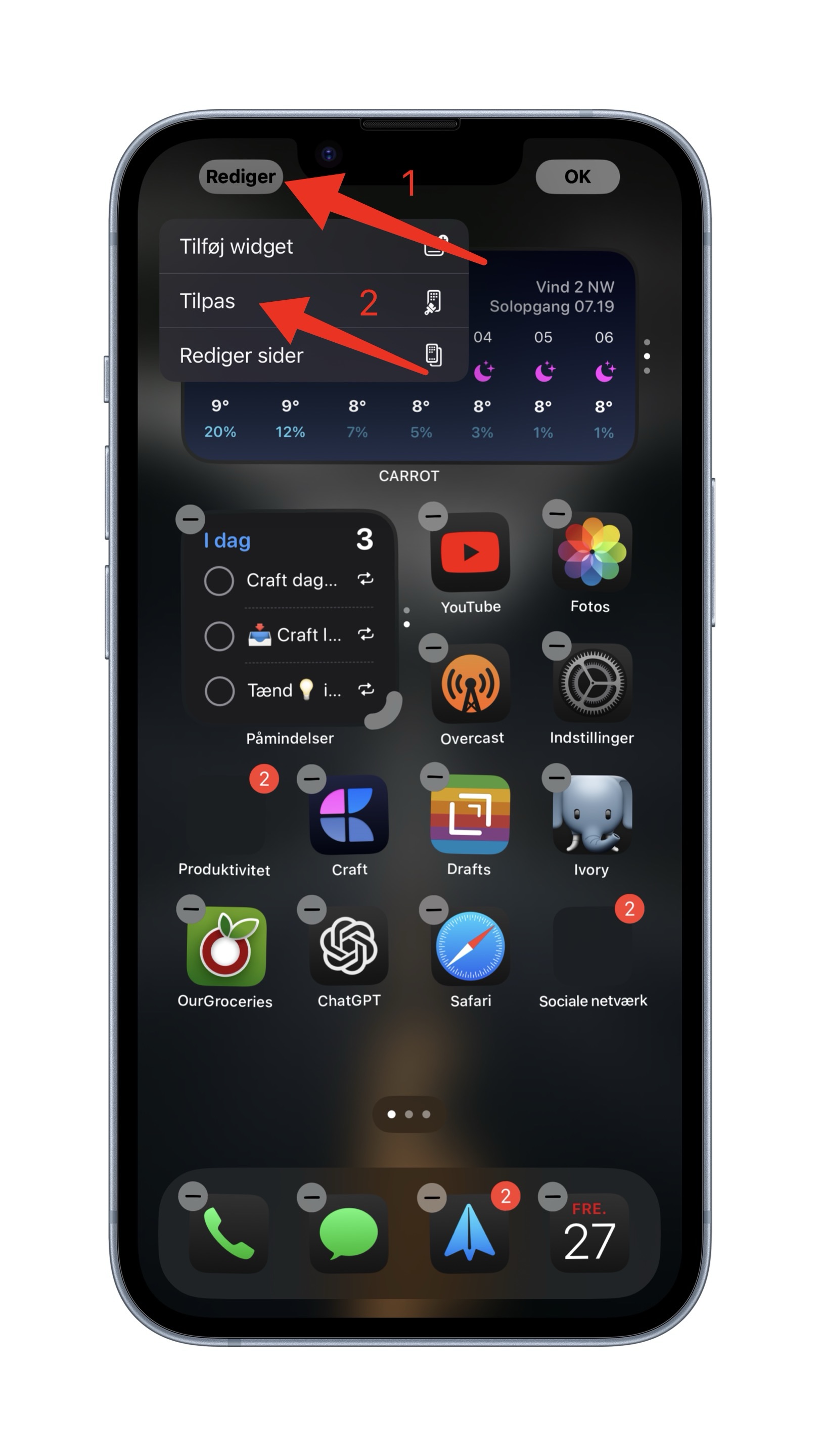 Først skal du trykke og holde på et tomt sted på skærmen hvorefter der vil dukke en “rediger” knap op og derefter trykker du på: